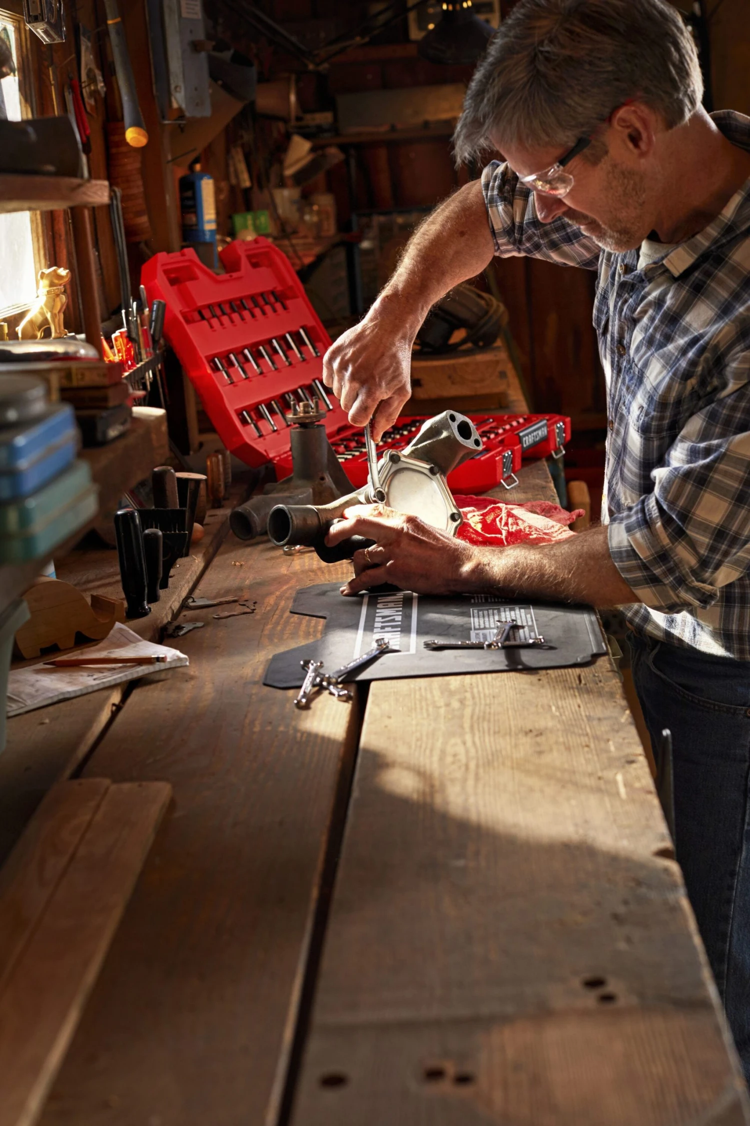 81-piece Gunmetal Chrome Mechanics Tool Set is made for the auto-enthusiast, semi-pro, or do-it-yourselfer. This set comes with the new 120-Tooth ratchet that provides maximum accessibility in tight spots. With its slim head and 3-degree arc swing, you can get into narrow spaces with ease and quickly tighten or loosen a fastener. This set also comes with two extension bars, a universal joint, a spark plug socket, a bit adapter, and a wide range of shallow and deep sockets for added utility. The gunmetal chrome finish provides durable rust resistance, easy cleaning, and a professional look. All of these components are packed in a compact mobile case perfect for storage in a toolbox, garage, a vehicle or proudly displayed on your workbench. The case has durable metal clips and metal removable hinges for splitting the case into two for storage or ready availability. The case also has exterior grooves for stacking with same size cases. Take on your next project with our Gunmetal Chrome 81-piece tool set.