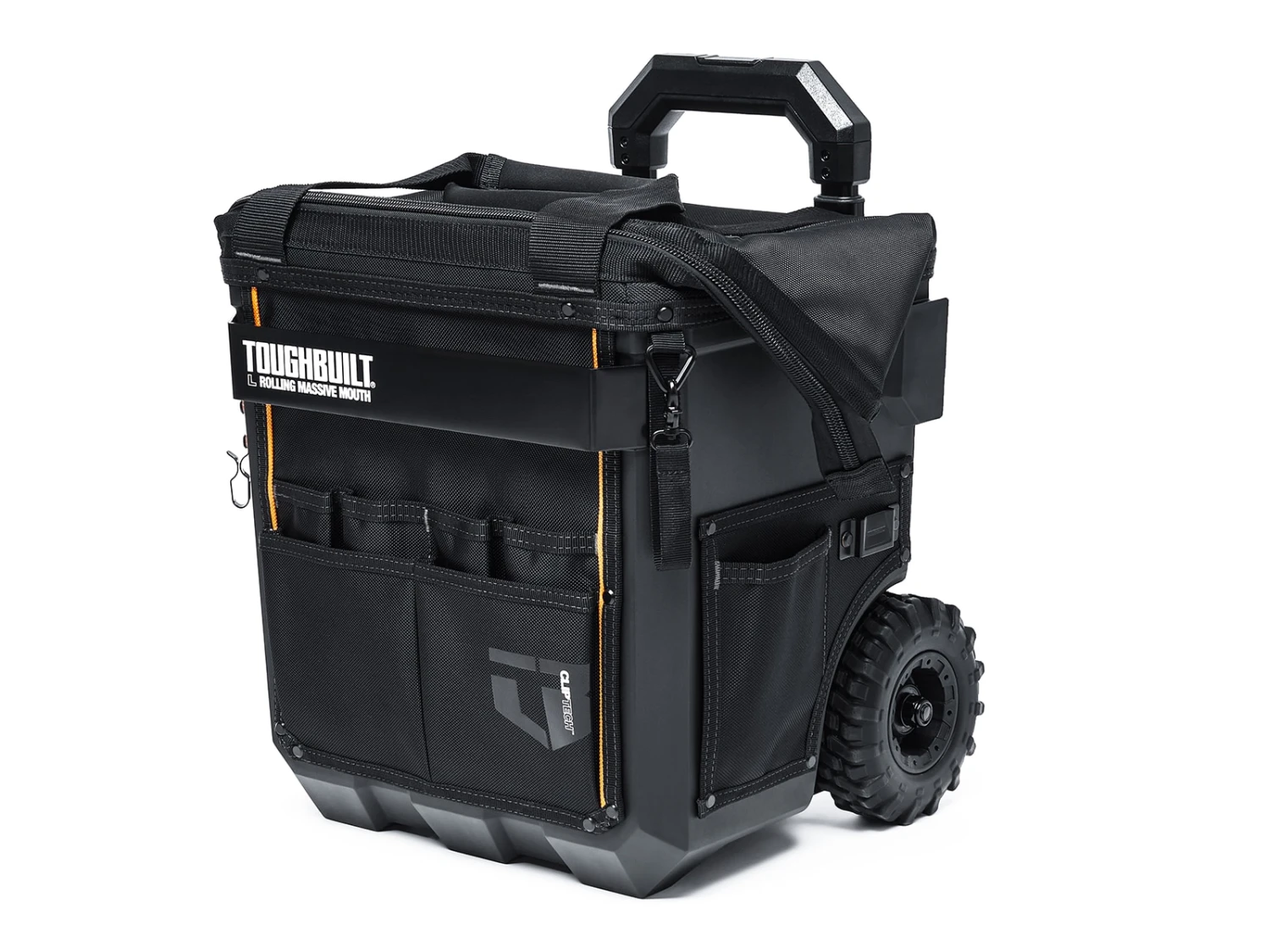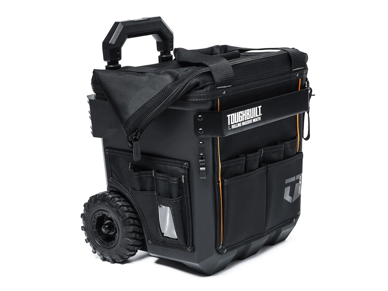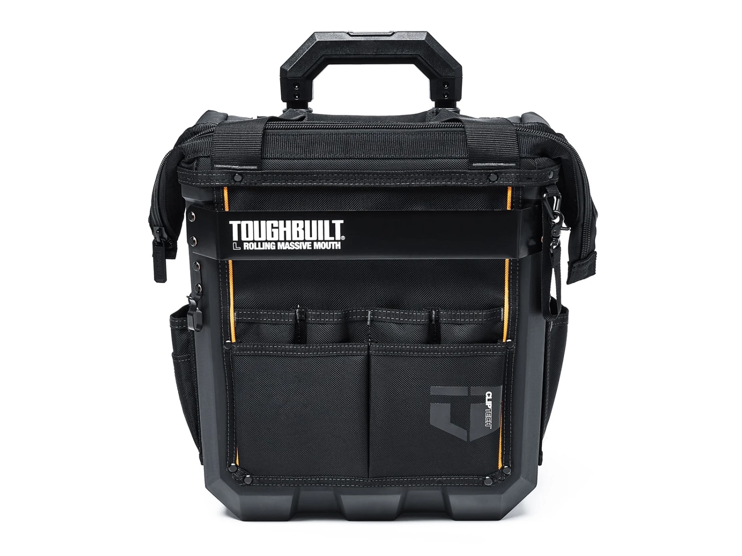 Organize your tools faster and easier.The ToughBuilt® Large Rolling Massive Mouth® Bag transforms how professionals carry tools and supplies. The patented massive opening is the widest in the market for superior accessibility. It is compatible with all ToughBuilt clip-on pouches for the most efficient tool organization.The hard body construction outlasts any fabric bag. Made with high-quality PP+HDPE plastic, 1680D fabric, heavy-duty steel hardware and rivet reinforcement. Its versatile structured external pockets flex to securely hold tools in place. This hard-working bag keeps up with the professional’s rigorous demands and is backed by our Limited Lifetime Warranty.