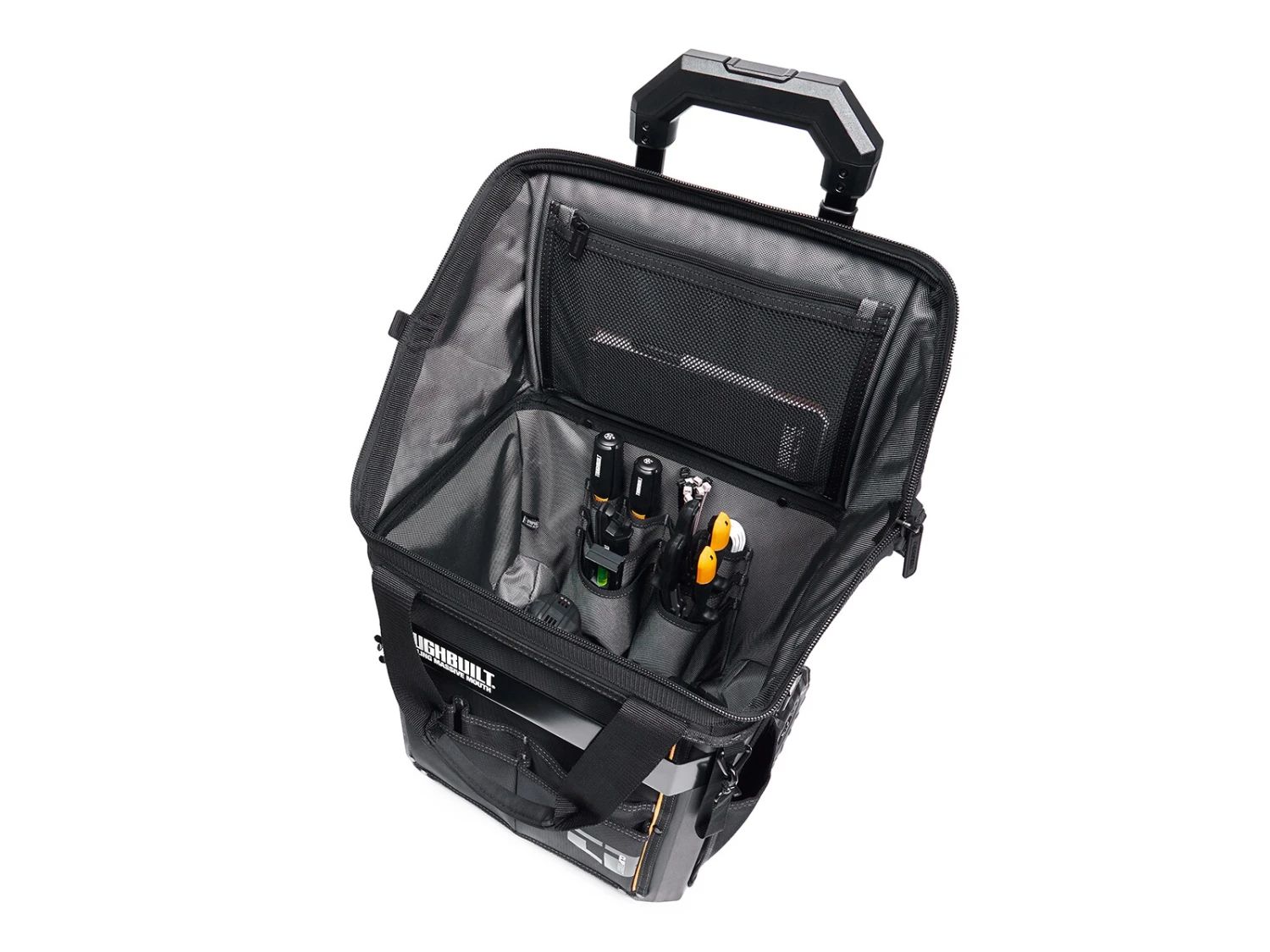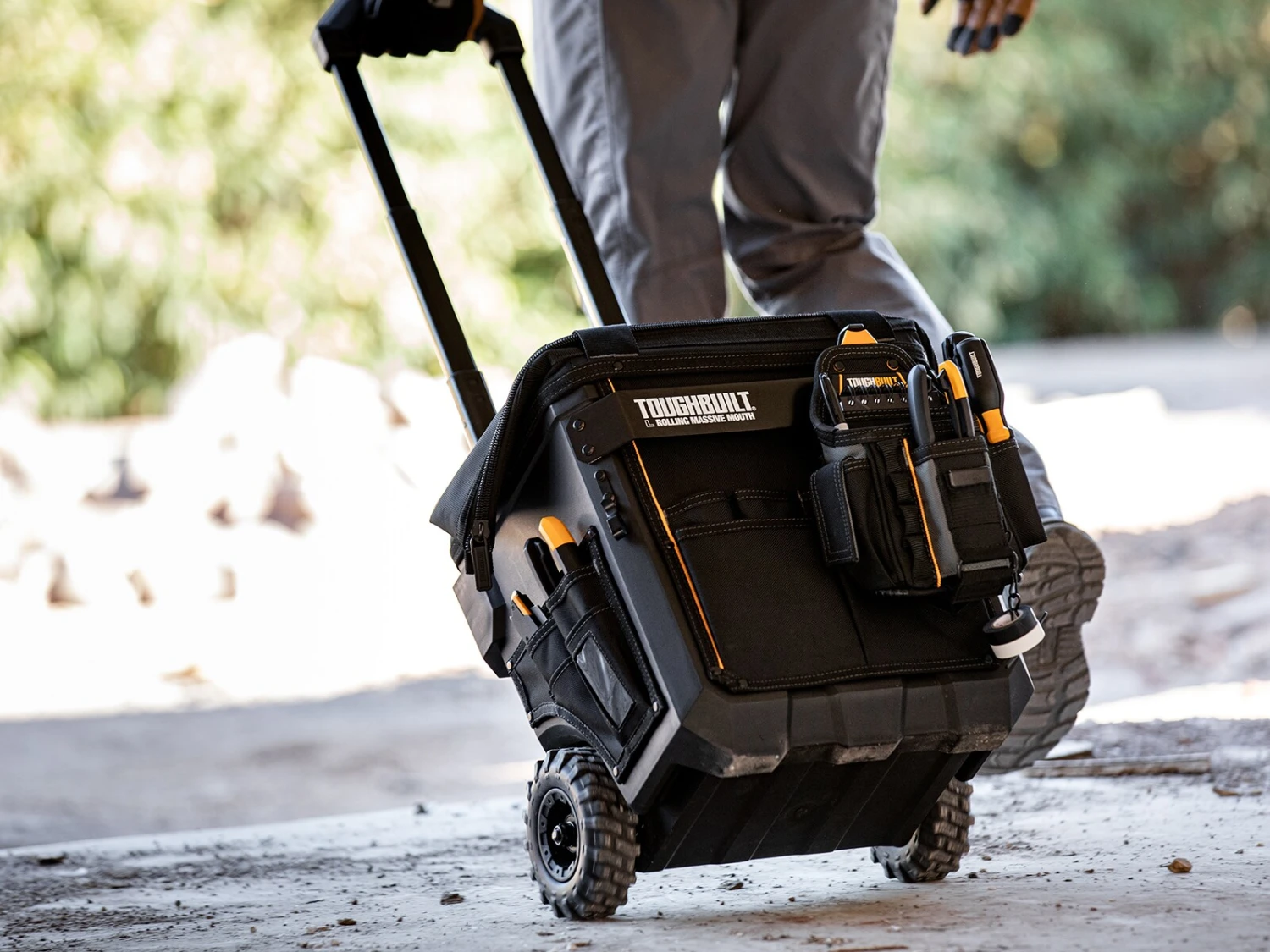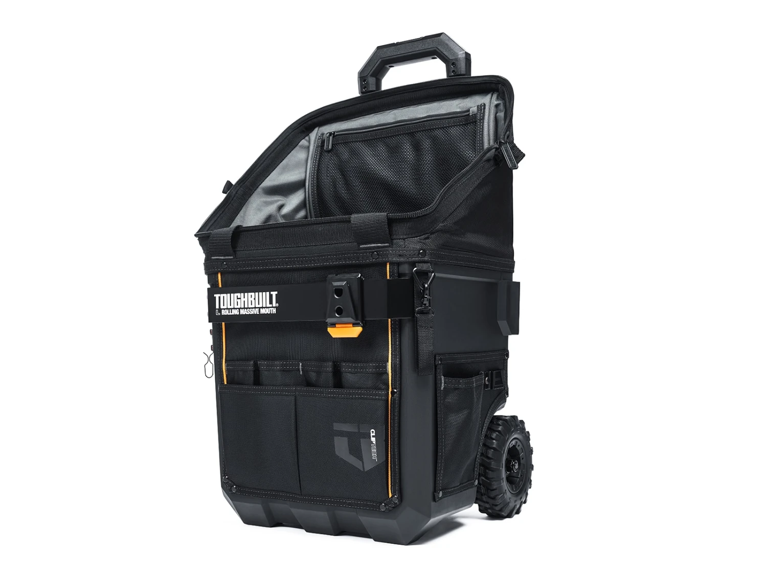 Organize your tools faster and easier.The ToughBuilt® Large Rolling Massive Mouth® Bag transforms how professionals carry tools and supplies. The patented massive opening is the widest in the market for superior accessibility. It is compatible with all ToughBuilt clip-on pouches for the most efficient tool organization.The hard body construction outlasts any fabric bag. Made with high-quality PP+HDPE plastic, 1680D fabric, heavy-duty steel hardware and rivet reinforcement. Its versatile structured external pockets flex to securely hold tools in place. This hard-working bag keeps up with the professional’s rigorous demands and is backed by our Limited Lifetime Warranty.