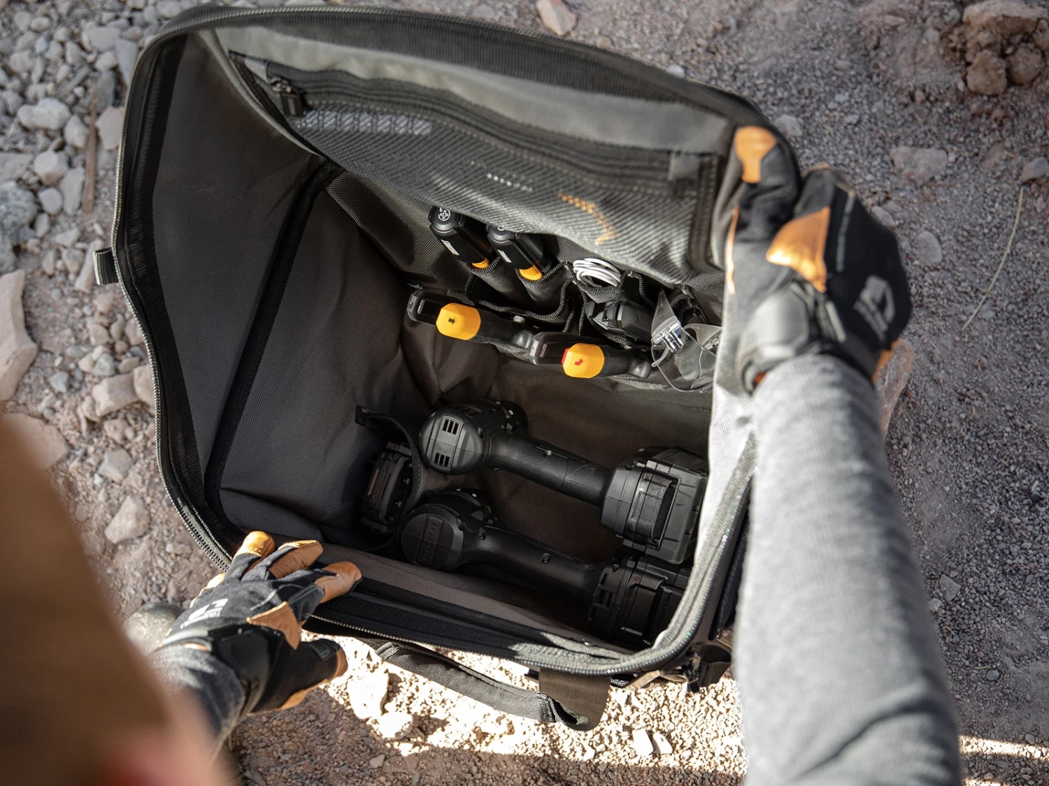 - Structured external pockets that flex to securely hold tools in place