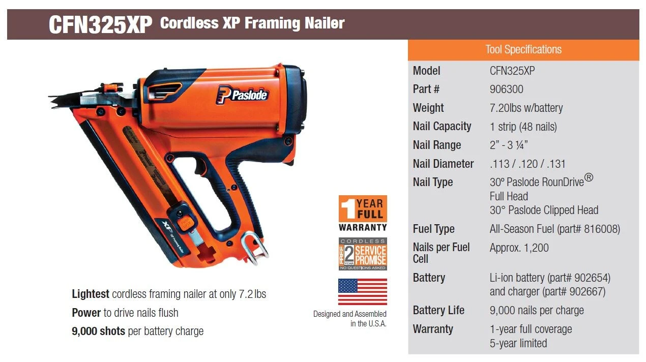 The Paslode Cordless XP Framing Nailer delivers power, performance, and comfort for framing applications, without the hassle of a hose and compressor. As the lightest cordless framing nailer available, it’s easy and comfortable to use all day. It drives 2 in to 3-1/4 in 30-degree framing nails flush into the hardest framing materials, and will keep you running with 9,000 shots per charge. It comes in a hard case with a battery and charger.