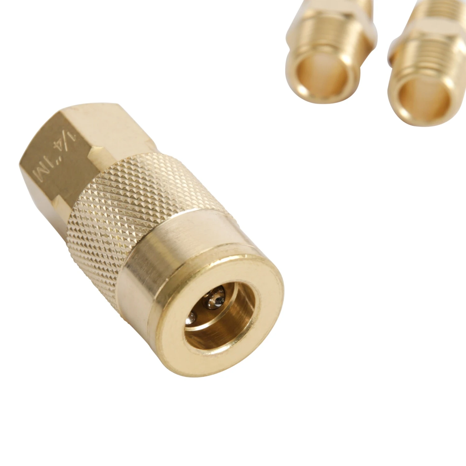 - Includes blow gun, rubber tip, tire gauge, sports ball needle, tapered tip, thread seal tape, two 1/4-in female plugs, two 1/4-in male plugs, 1/4-in female coupler, 2 quick connectors, two 1/4-in male couplers, safety nozzle, dual tire chuck and storage