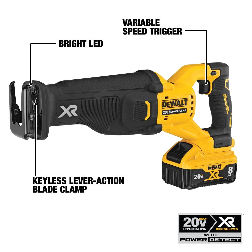 The new range of DEWALT 20V MAX XR tools with POWER DETECT tool technology maximize performance when used with high-capacity XR batteries. Using the 20V MAX 8Ah battery, the DCS368 Reciprocating Saw will output up to 44% more power and get 60% more runtime than the standard XR Reciprocating Saw DCS367P1.