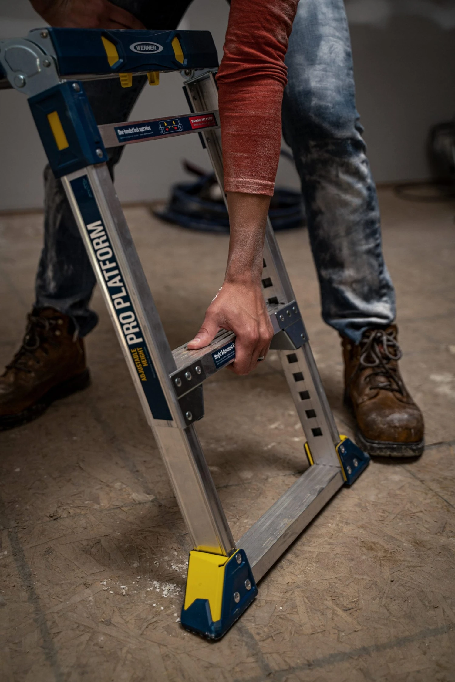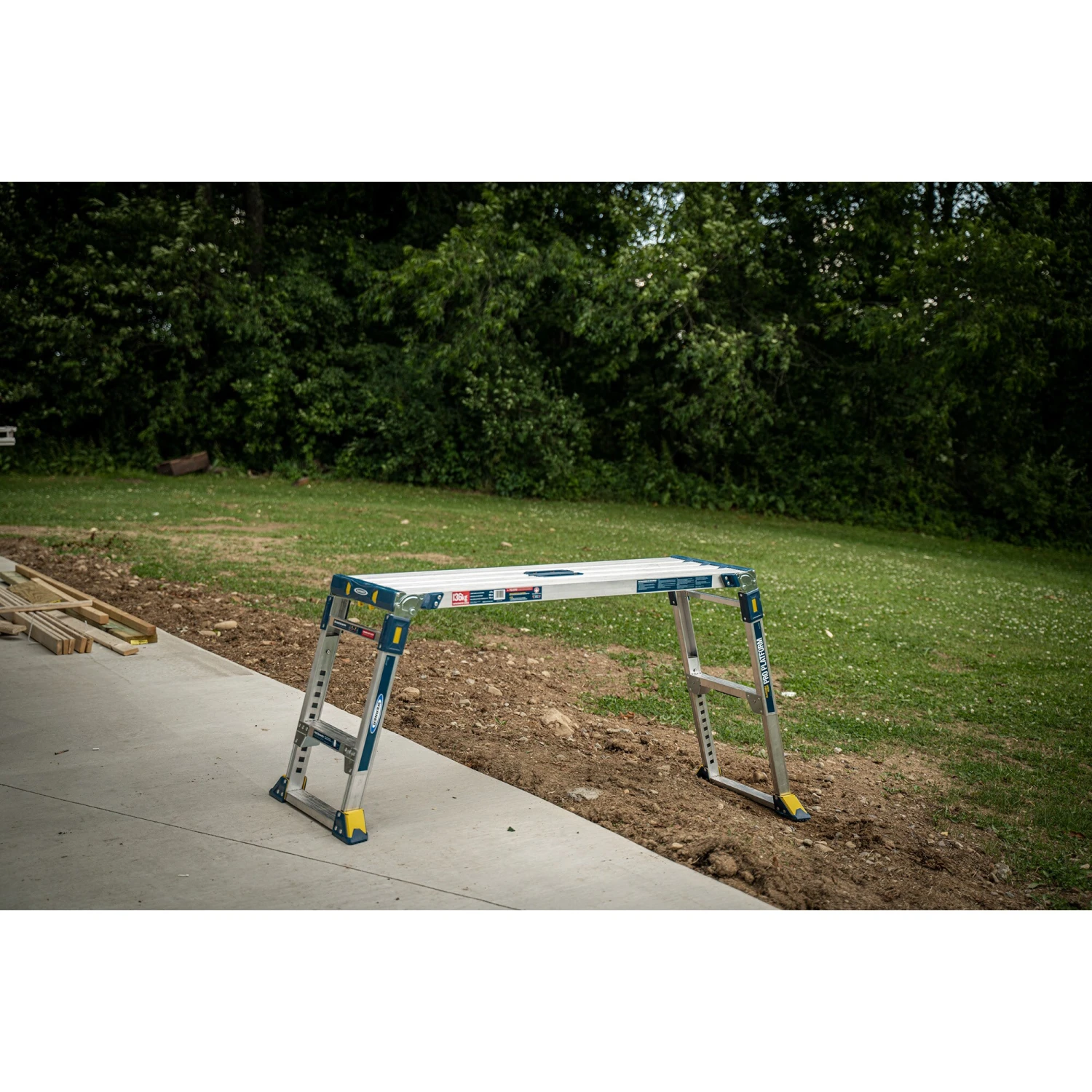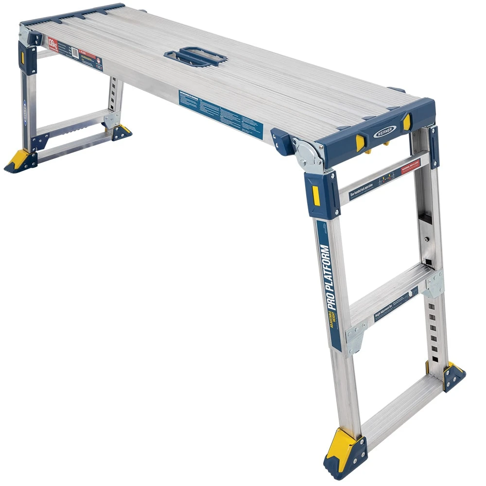 - Height adjustment, folding legs, and protective bumpers allow you to set the work platform on stairways
