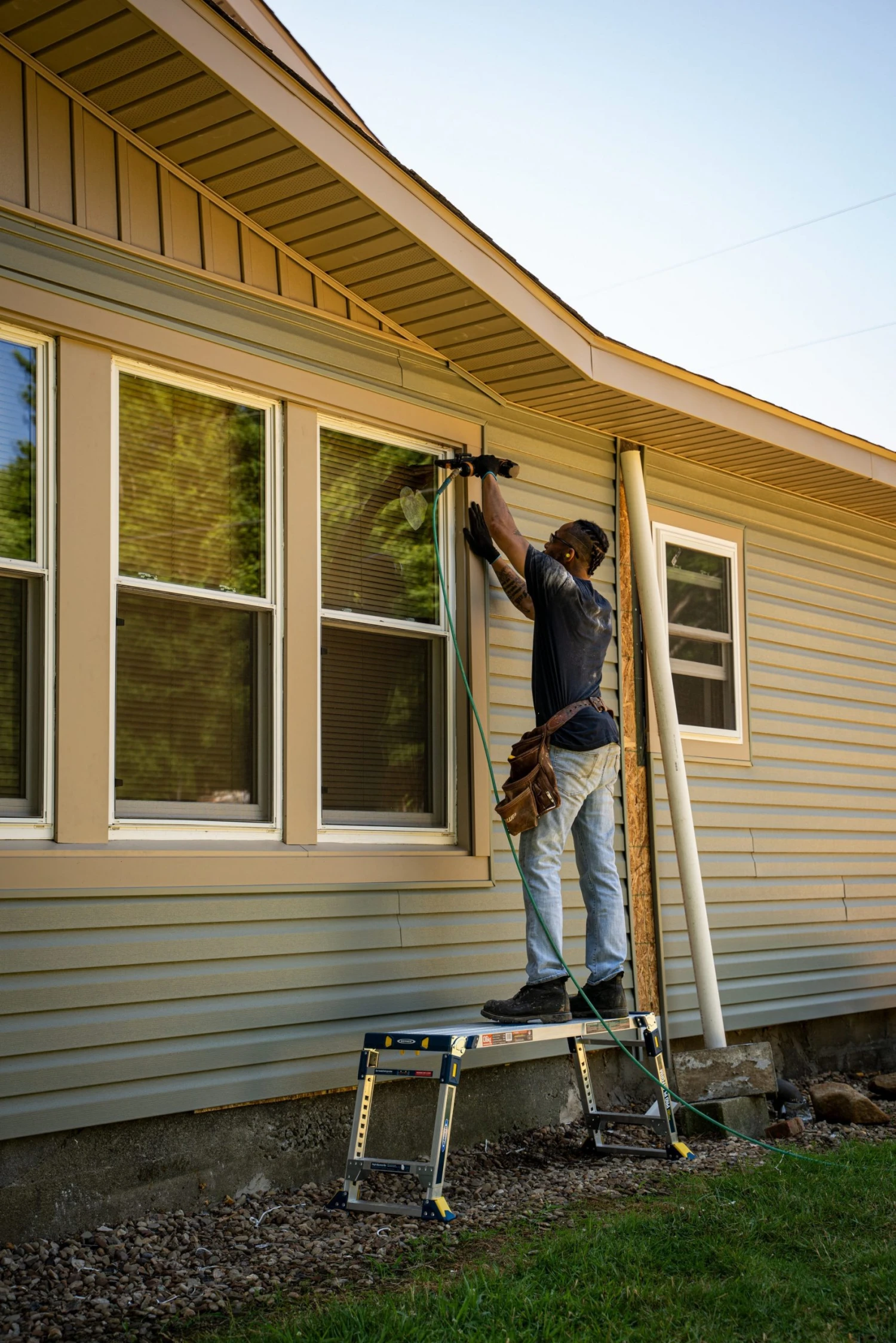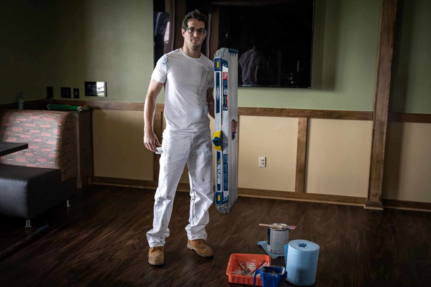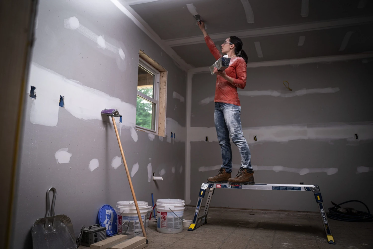 - Height adjustment, folding legs, and protective bumpers allow you to set the work platform on stairways