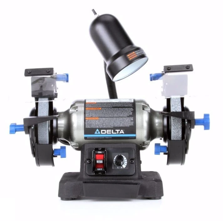 - Delta 6-in bench grinder with light features 36 and 60 grit wheels for sharpening and grinding operations
