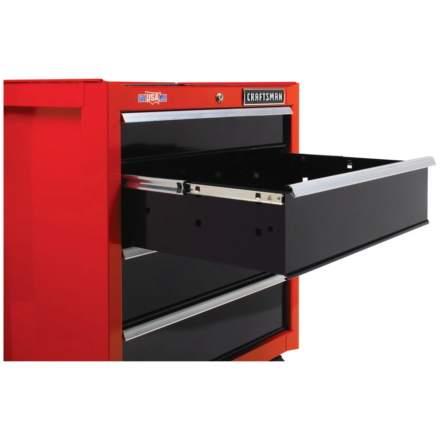 Proudly Made in the USA with Global Materials in Sedalia, Missouri. The 2000 Series CRAFTSMAN® 26-in Wide 4 Drawer Rolling Tool Cabinet utilizes an all steel I-Frame® Double Wall Construction. Each drawer can support 75-lbs and features heavy-duty soft close drawer slides that gently pull themselves shut without slamming. This helps keep your tools in place and ensures your drawers stay closed. The 4-1/2-in x 1-1/2-in casters with 2 that lock and 2 that swivel support up to 650-lbs!