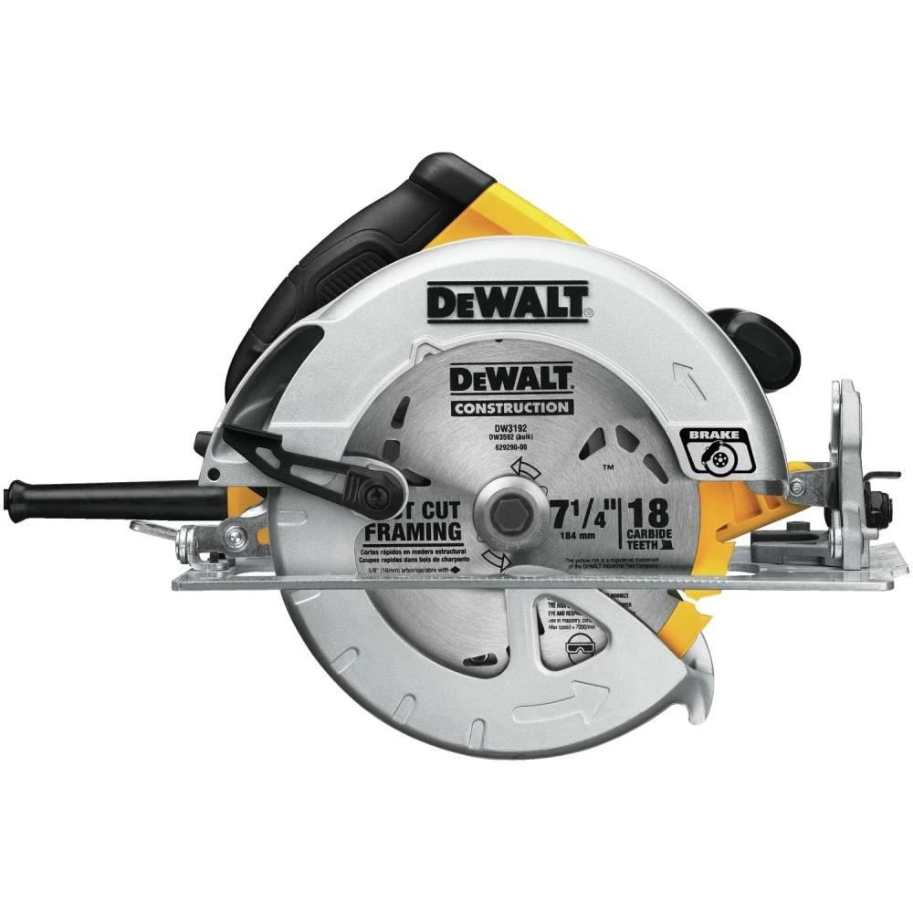 DEWALT 7-1/4 In. lightweight circular saw with electric brake. Depth of cut capacity of 2-9/16 In. ball bearing lower guard provides long life in environments. Durable high grade aluminum smooth base for accurate cuts. Lower guard design improves performance when making bevel cuts and cutting shims. An integrated dust blower allows the user to clear its line of sight while cutting. Patented tough cord protection system, provides 3x durability against cord pull-out.