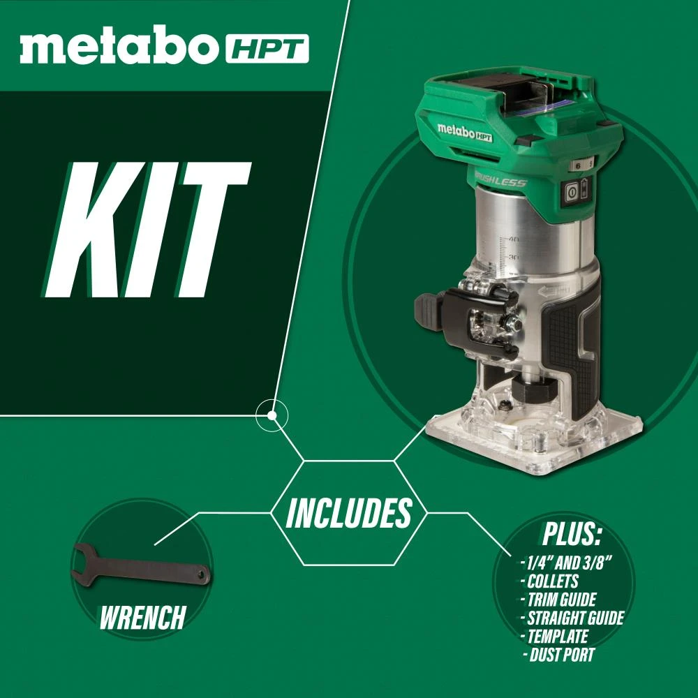 Metabo HPT’s first Cordless Trim Router has the power of a corded router while providing the convenience of a cordless tool. No cord means having the complete freedom to tackle your routing work anywhere. You will no longer need to be tethered to a power cord or require power on the job site or workshop. At only 2.5 lbs., this brushless router offers the most control in its class. This lightweight powerhouse is a full 26% lighter than the competition. The variable speed lets you dial up whatever the job calls for, offering speeds between 10,000 to 30,000 revolutions per minute. This router features the Metabo HPT signature ergonomic grip, a one-handed power/trigger system, and a handy ambidextrous base mounting option. The M1808DAQ4 is equipped with a bright LED light that completely illuminates the workspace to maintain accuracy. Keep dust to a minimum by easily connecting a vacuum to the newly designed dust collection port. This complete tool comes with both a 1/4 inch and 3/8 inch collet, trimmer guide, straight guide, template, dust collection port, and a bit changing wrench. The M1808DAQ4 Cordless Trim Router is part of the expanding MultiVolt system of power tools from Metabo HPT. It accepts any lightweight 18V battery or MultiVolt battery for extreme power, and up to 8.0Ah of runtime! It is also backed by the Metabo HPT’s Lifetime Lithium Ion tool body warranty, making it a safe bet for the long haul!