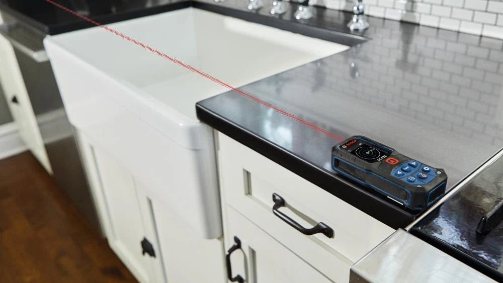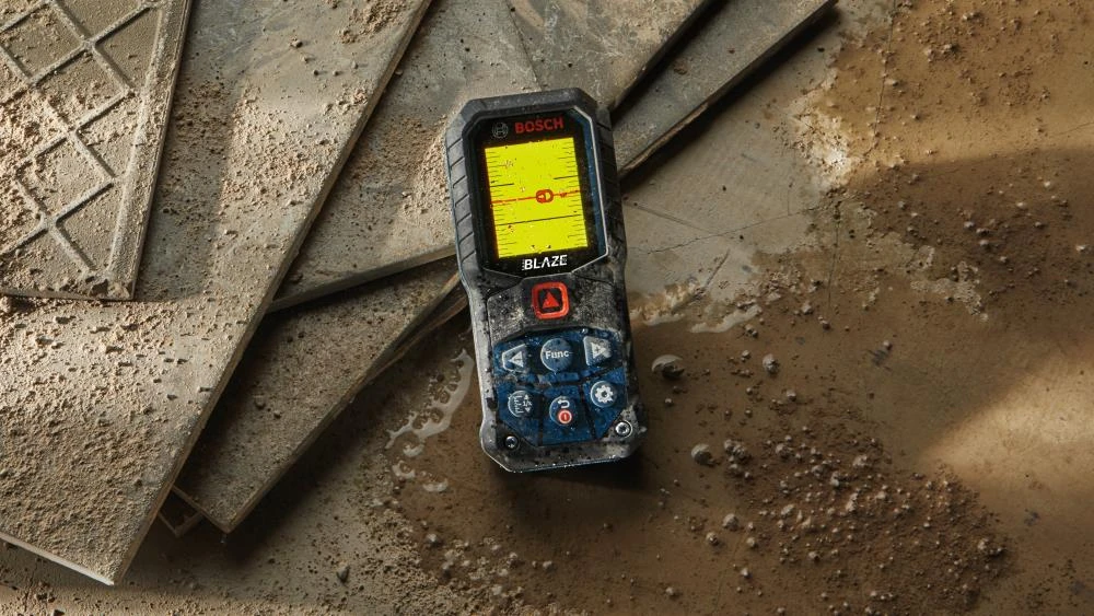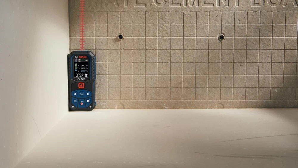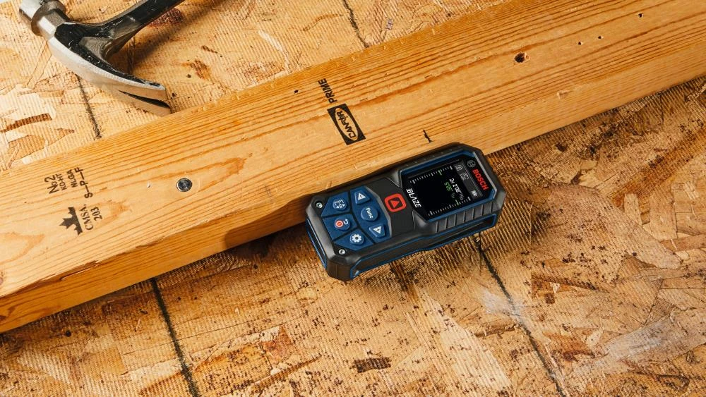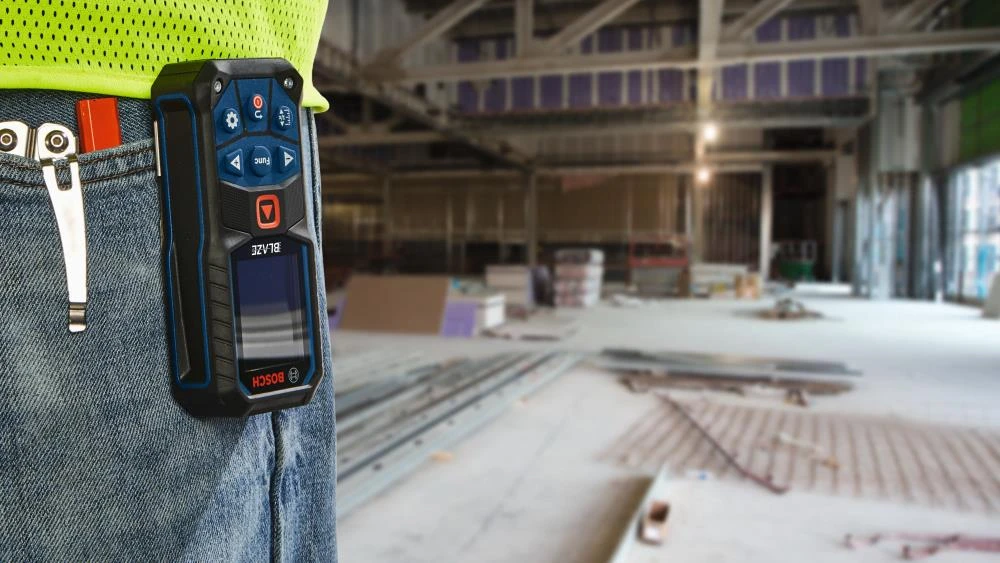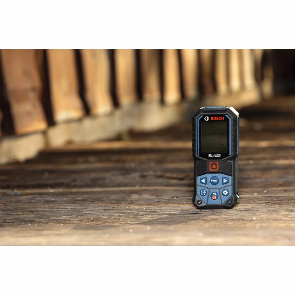 This 165 Ft. laser measure is a fully featured tool with an easy-to-read color display, great accuracy, an inclinometer for tilt angle and reinforced housing for durability. The Bosch BLAZE™ GLM165-27C features an inclinometer, which shows the tilt angle up to 360° for easy angle and indirect measurements. The laser has accuracy up to ±1/16 In., plus it includes a rounding button that rounds the measurement to the fraction that best suits the application and haptic feedback for loud jobsites. The digital laser measure also offers Bluetooth® functionality, so users can digitally transfer measurements to a smartphone or tablet through the free MeasureOn app. It also has full rubber overmold housing, designed to be similar to a roll cage. It is IP65 rated and has an ergonomic design for better grip. It includes 11 different measuring functions, including real-time length, length, area, volume and indirect functions, and addition/subtraction capability.