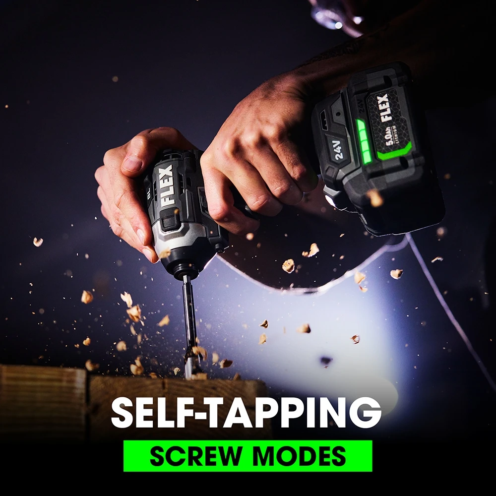 The FLEX 24V Brushless 1/4-in. Quick Eject Hex Impact Driver with Multi-Mode delivers unrivaled power for the toughest fastening applications. Take control with three speed modes that lets you adapt to the application at hand. Work with complete confidence and enhanced capabilities, including self-tapping screw modes which prevent over-tightening and strippage. Switch gears fast with the quick eject collet for easy, one-handed bit changes. Built-in LED lighting keeps you on the mark. All this dependability is built on the FLEX Advantage of unmatched battery power, runtime, and fast-charging speed. Protected with a 5-year end-to-end warranty.