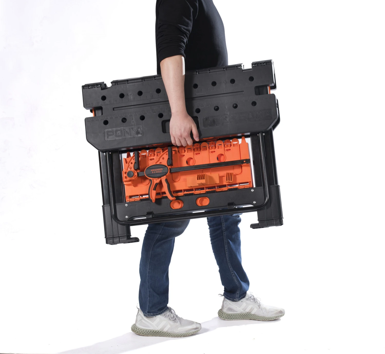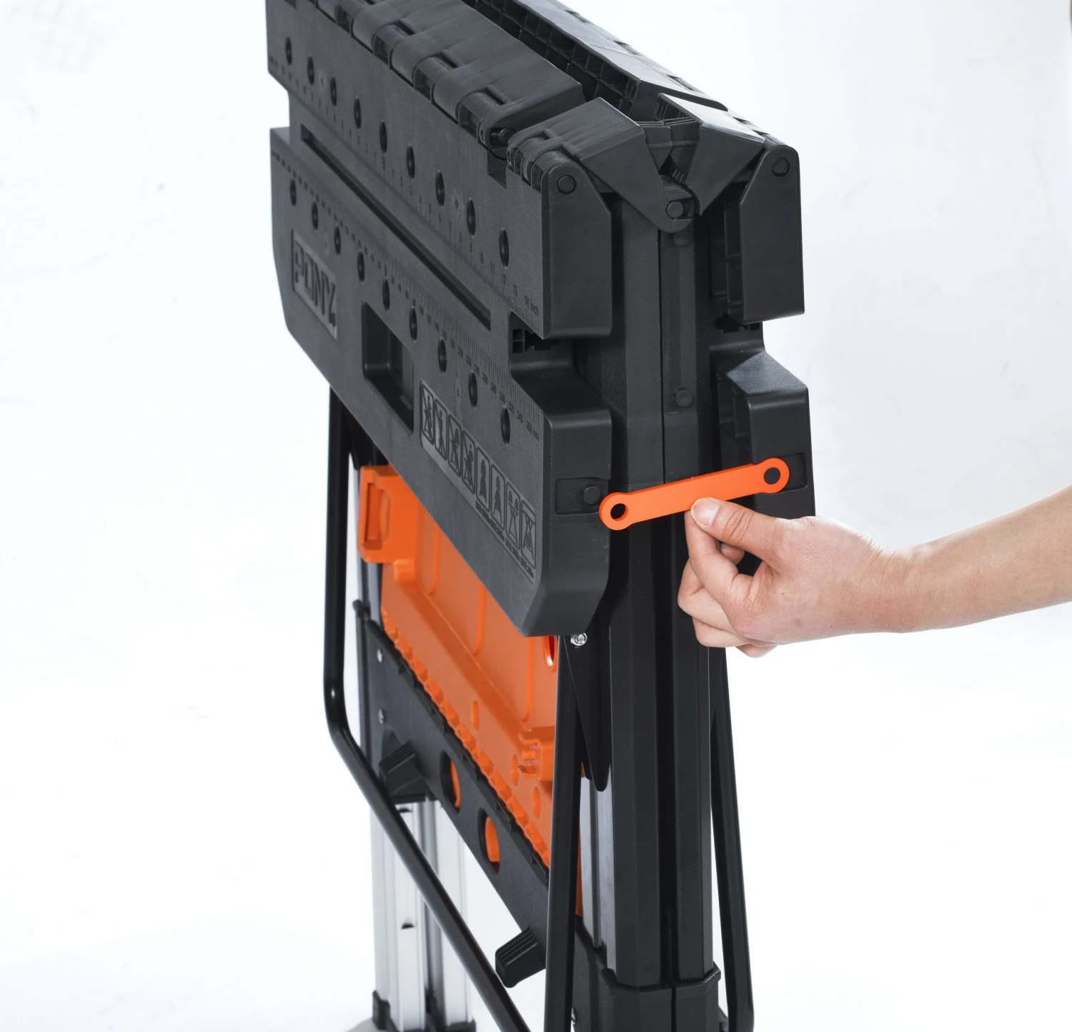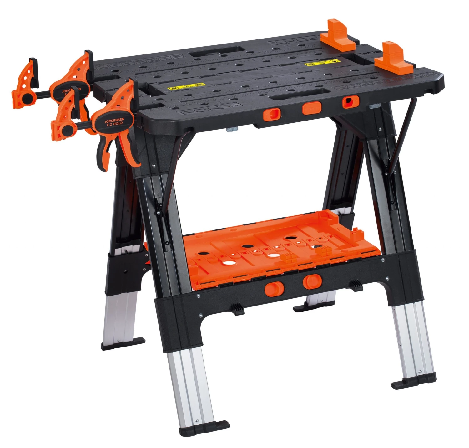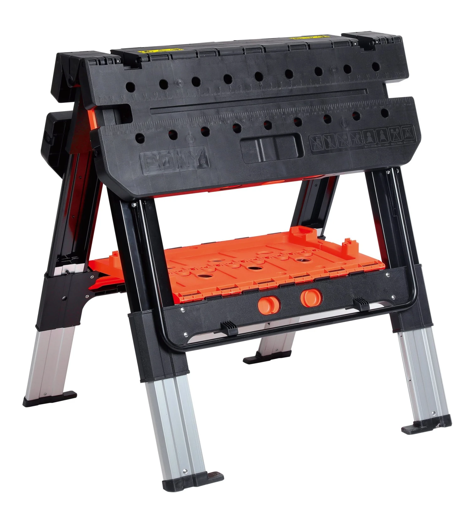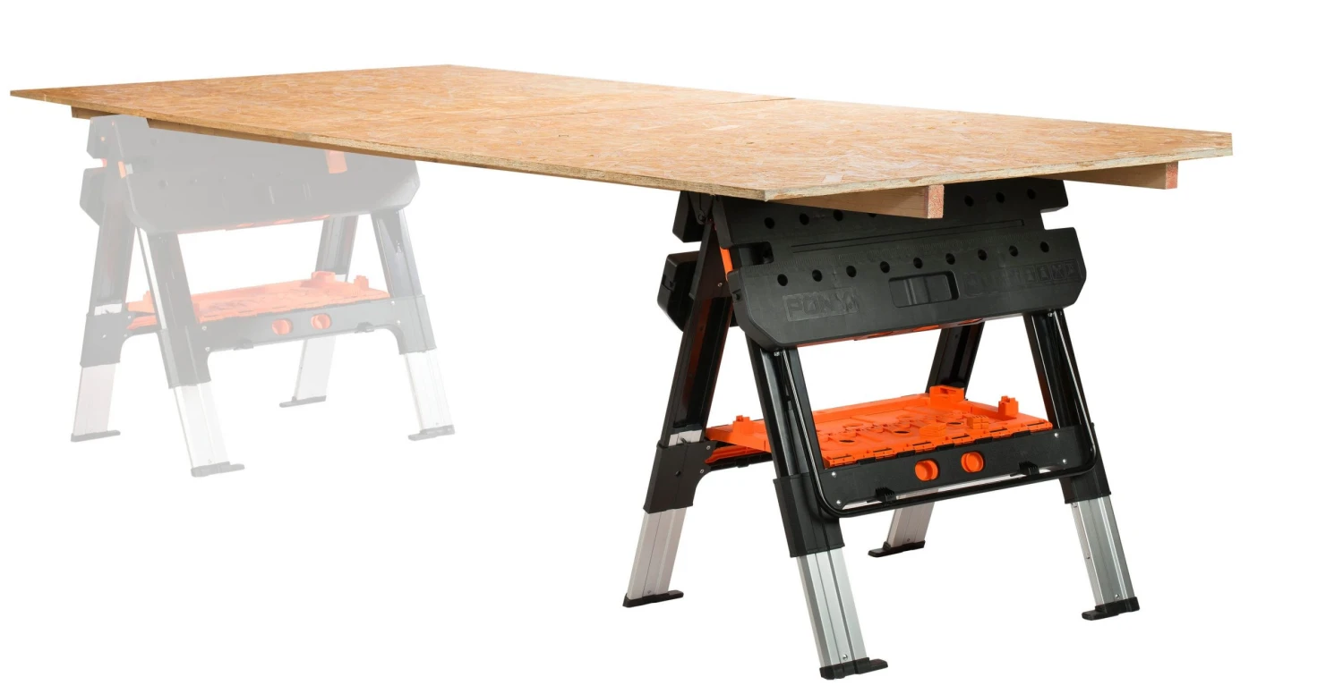 - Converts between a work table and sawhorse in seconds