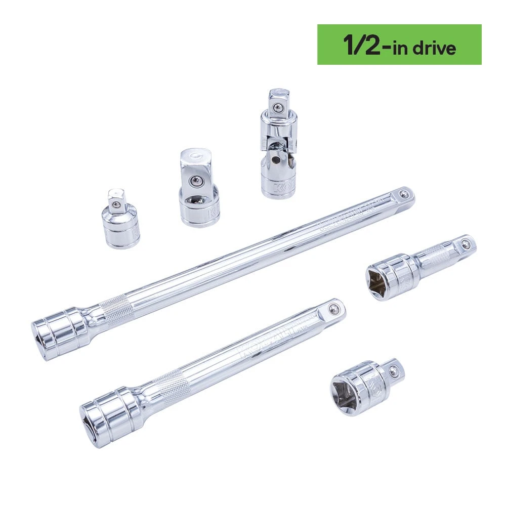 - 1/2-Inch drive accessories include a 1-1/2-in extension, a 3-in extension, a 6-in extension, a 10-in extension, a 1/2×3/8-in adapter, a 1/2×3/4-in adapter and a universal adapter